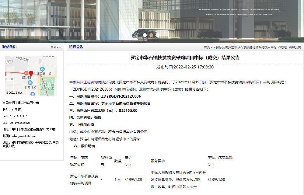 鼎點(diǎn)娛樂(lè)工程咨詢有限公司受《羅定市華石鎮(zhèn)人民政府》的委托,于2021年11月19日就(羅定市華石鎮(zhèn)扶貧物資采購(gòu)項(xiàng)目)采購(gòu)項(xiàng)目編號(hào):(ZDYRGDYF2021ZC006)詢價(jià)進(jìn)行采購(gòu)。現(xiàn)就本次采購(gòu)的中標(biāo)(成交)結(jié)果公告如下:一、采購(gòu)項(xiàng)目編號(hào):ZDYRGDYF2021ZC006二、采購(gòu)項(xiàng)目名稱(chēng):羅定市華石鎮(zhèn)扶貧物資采購(gòu)項(xiàng)目三、采購(gòu)項(xiàng)目預(yù)算金額([詳細(xì)]